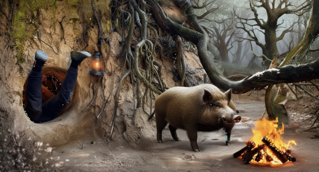 I decided to build a secret dugout deep inside a wild boar’s lair, right in the heart of the forest. My goal was to create a hidden shelter using only my bushcraft skills and hand tools, designed for survival and off-grid living in harsh wilderness. The first step was to carefully pick a spot that offered some natural cover yet was practical for digging. Once selected, I started digging into the earth, using a sturdy shovel and controlled effort to carve out a spacious pit for the dugout.