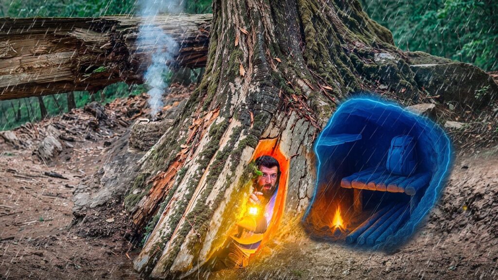 In this video, I build a secret dugout shelter hidden under the roots of a large, old tree using only basic bushcraft survival skills and simple tools. The build takes place during a rainstorm, which really highlights how effective an underground shelter can be in protecting from harsh weather conditions in the forest. I start by digging the foundation carefully and reinforcing the walls with sturdy logs to create a secure structure.