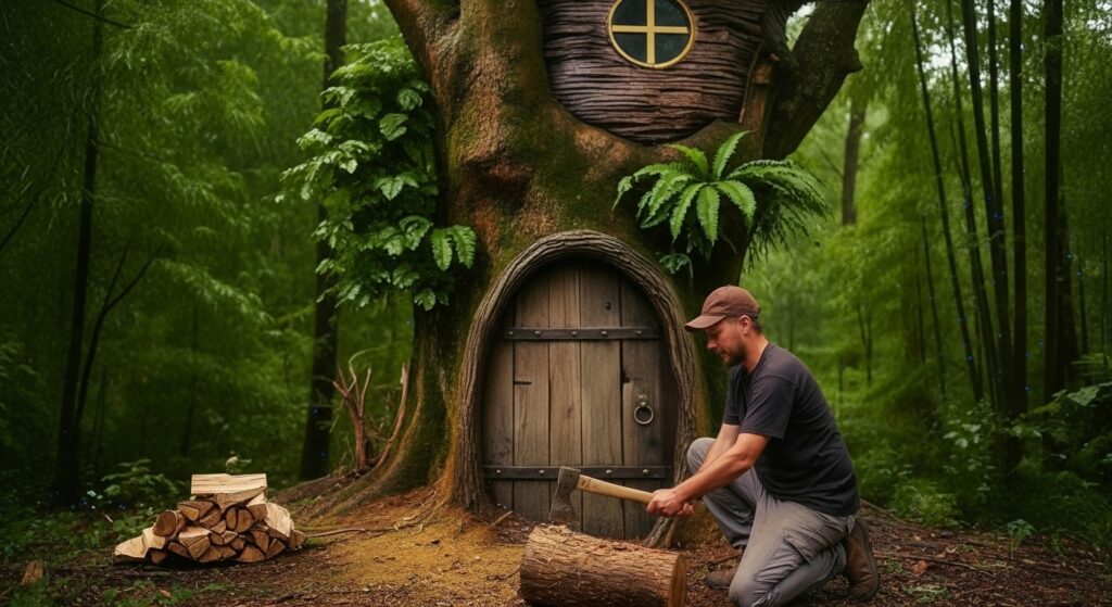 The process began with clearing out the inside of the hollow tree, carefully carving and shaping the space to make it livable. Every cut and build was done by hand, respecting the natural structure while making it safe and comfortable. I constructed a small platform inside the tree and built a roof to protect me from the elements, ensuring that my shelter was not only functional but also seamlessly blended into the forest environment.
