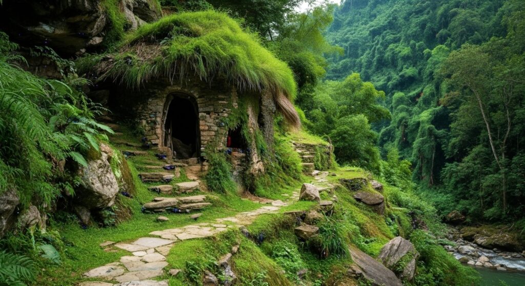 “A secret home underground, where clay walls keep me warm and fire fuels my meals. 🍃🔥 #BushcraftLife”