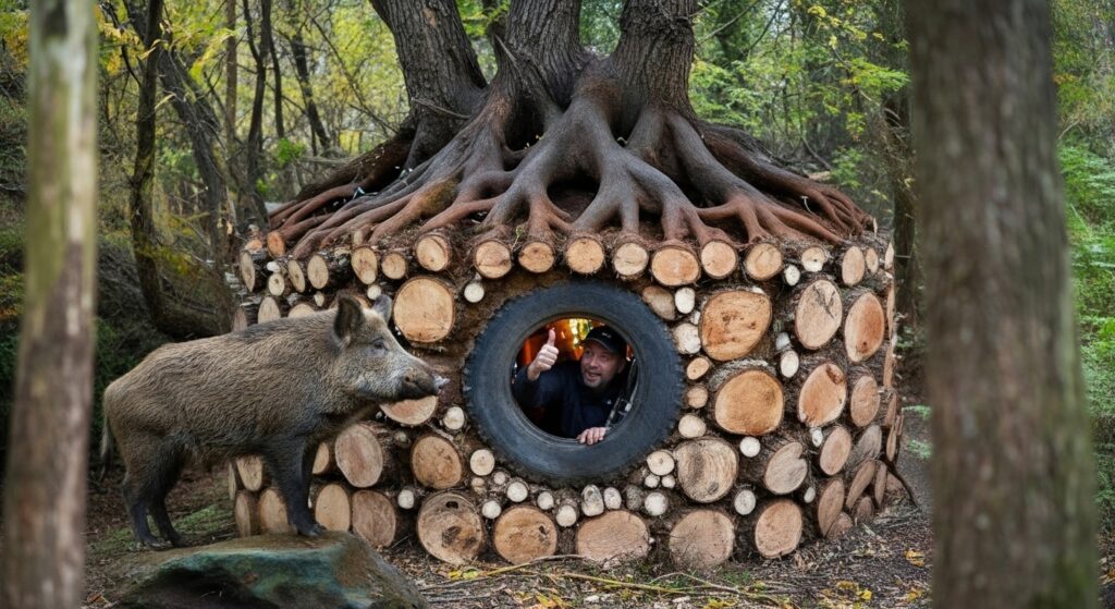 “Building shelter by day, facing wild boar by night—true bushcraft survival. 🌲🔥 #SurvivalSkills”