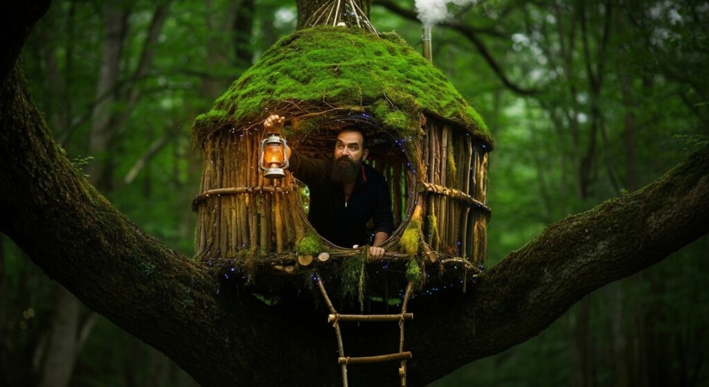 I started by carefully selecting the tree and gathering materials with the tools I brought along, including a waterproof fabric, strong ropes made from natural plant fibers, and my trusty axe and saw. Using the ropes, I constructed a solid foundation, rigging platforms and supports to make the nest sturdy. I also made a staircase to climb safely to the shelter. Every step required careful planning and precise work, especially in wet conditions that made everything slippery and challenging.
