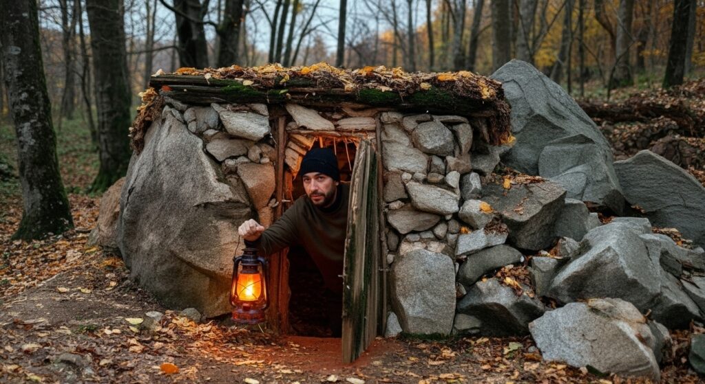 “Stone walls and a clay stove keep me warm and safe in the wild. 🔥🐕 #SurvivalSkills #OffGridLiving”