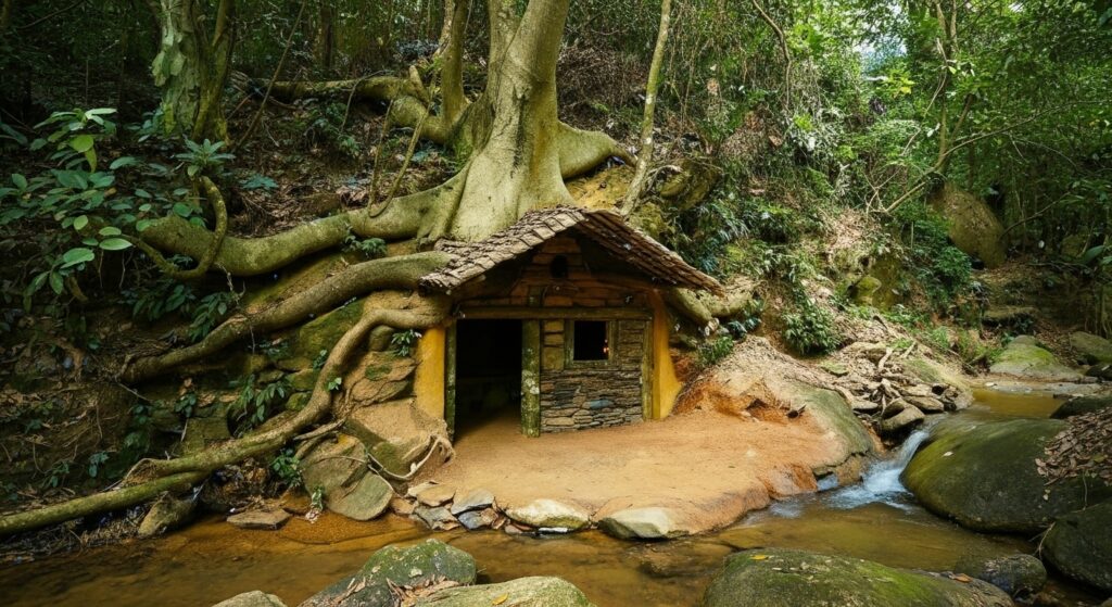 The shelter is carved carefully within the tree stump, using tools to break and shape the rocky interior into a livable space. I make sure the structure is strong and secure while working slowly to maintain the integrity of the stump. This underground house becomes a refuge that shields me from the elements and blends seamlessly with the forest floor above, offering both protection and camouflage.